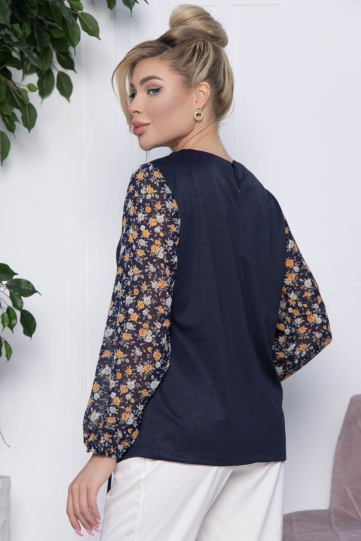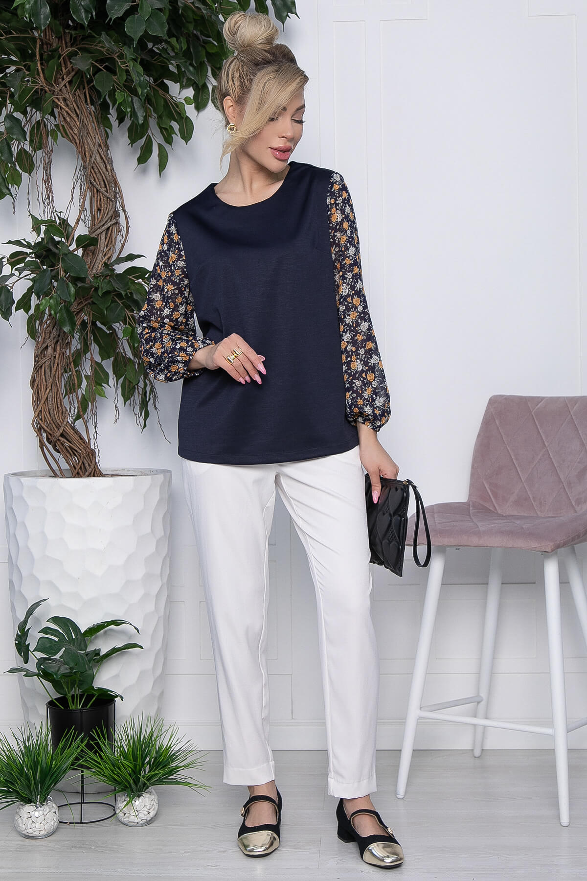 Стильный дизайн и женственные элементы создадут для вас новый гармоничный деловой образ. Классическая блуза прямого кроя, рукава втачные, собранные по низу на резинку. Такую блузу можно носить навыпуск или заправленной.