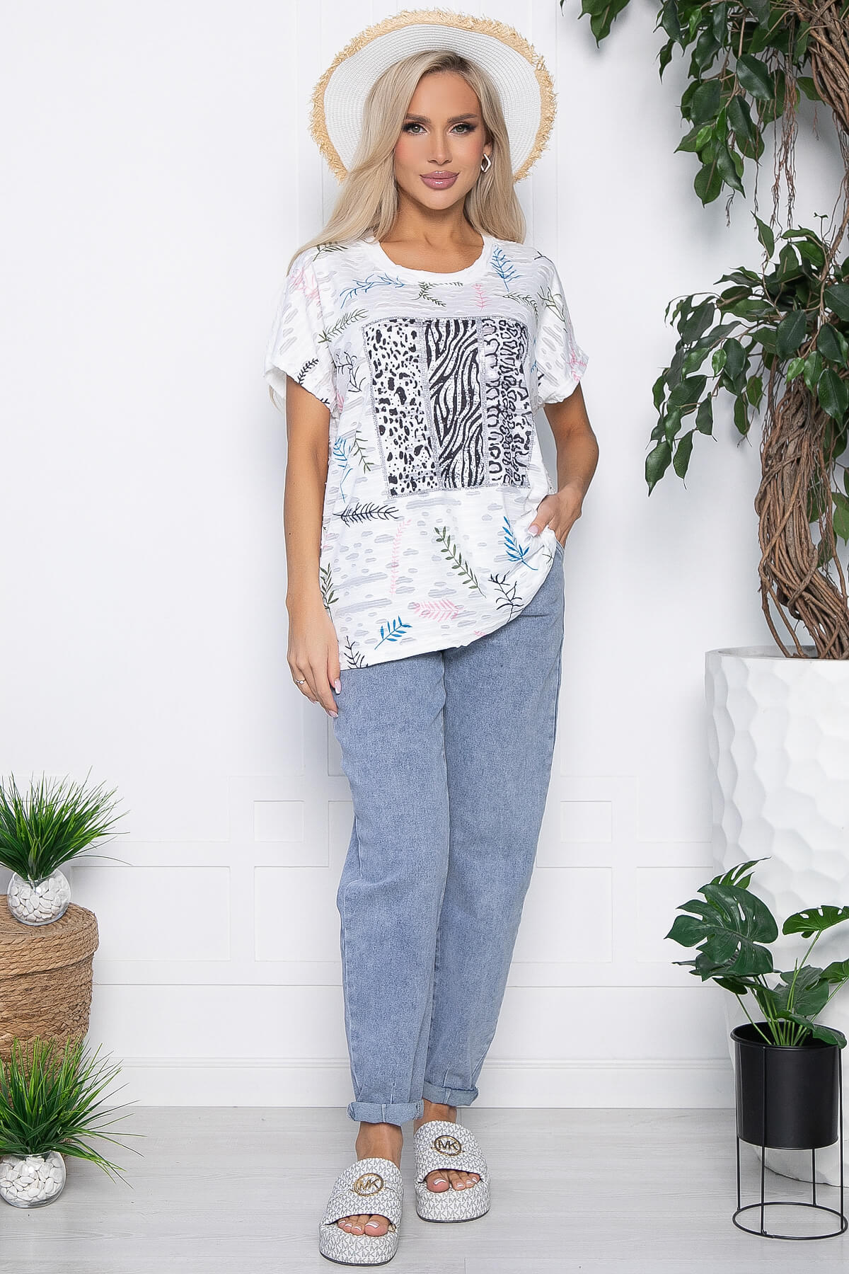 Лёгкая и стильная блузка с принтом, стразами и имитацией рванности выделит вас из толпы! Несмотря на свой яркий дизайн она прекрасно будет сочетаться с любой одеждой в вашем гардеробе. Блузка комфортная и пригодится для всех случаев - будь то повседневные прогулки, отпуск, или праздничный вечер.
