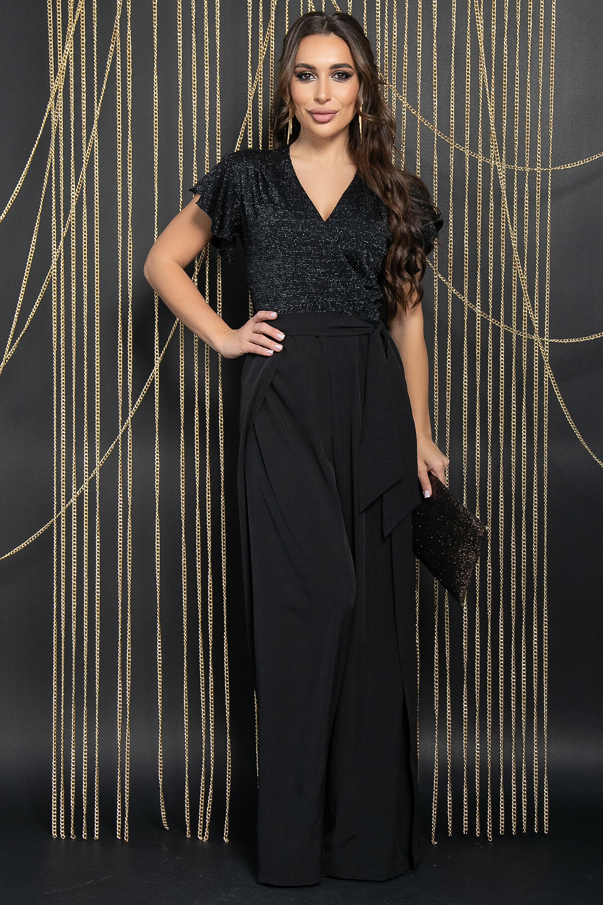 Роскошный комбинезон с широкими брюками на запах. В таком наряде можно появиться один раз в свете и остаться в памяти навсегда! Легкая драпировка в области груди добавляет немного объема, а пояс эффектно подчеркивает талию, обеспечивая образу утонченный стиль. По спинке застежка на потайную молнию. В таком комбинезоне вы будете неотразимой и чувственной.