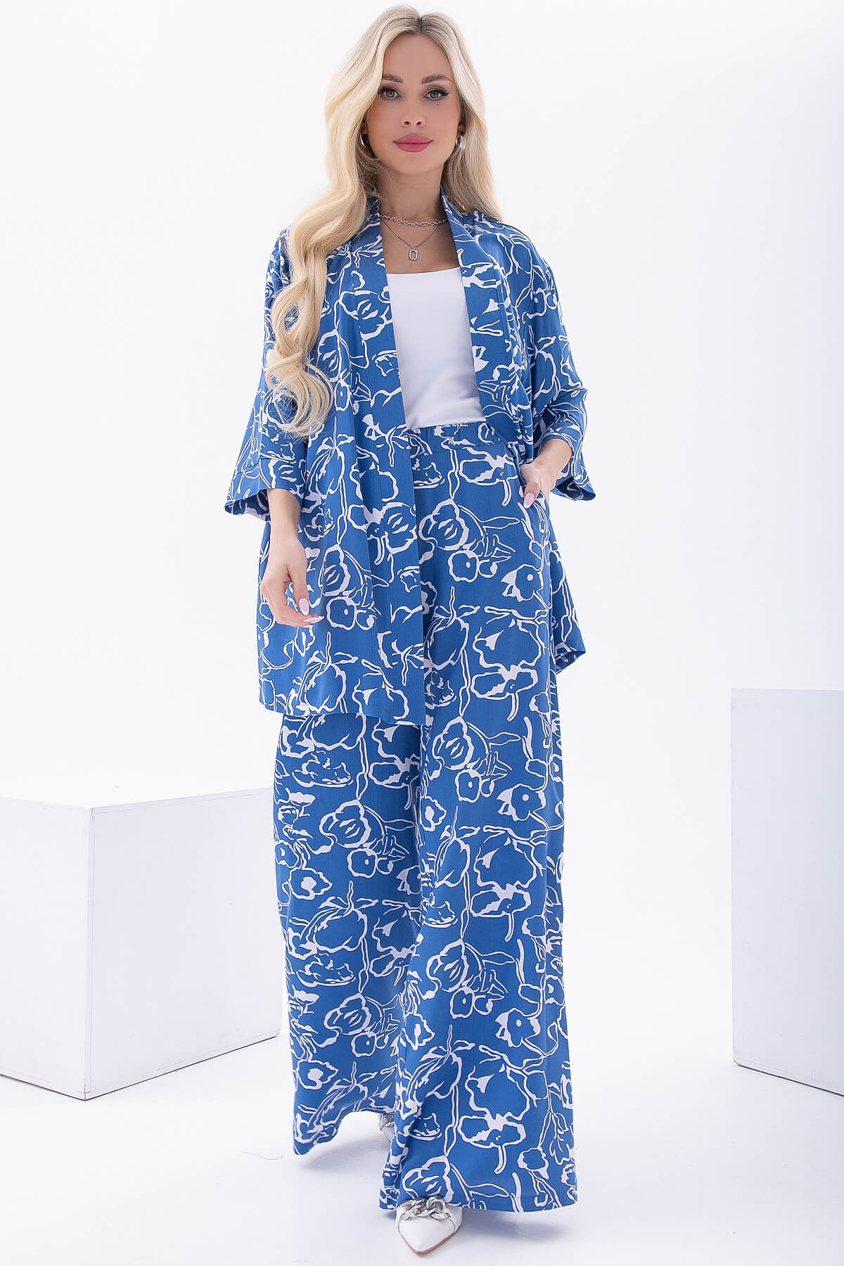 Костюм из лёгкой ткани идеально подойдёт для летнего расслабленного образа. Свободный крой не сковывает движений и дарит комфорт. Рукав укороченный со спущенным плечевым швом.В комплект входит пояс из основной ткани, который позволит подчеркнуть преимущества фигуры.