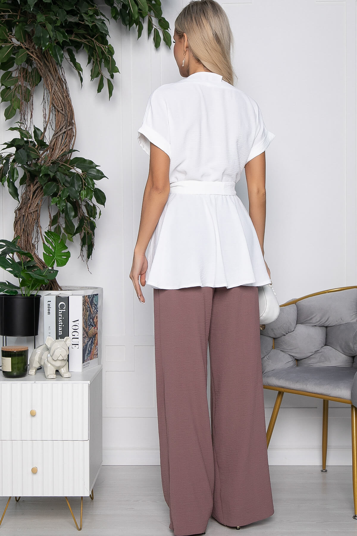 Стильный, удобный, женственный – этот универсальный комплект будет отличным выбором для любого случая. Брюки по талии на резинке обеспечивают идеальную посадку, по бокам расположены карманы. Блузка выполнена с имитацией запаха, в комплекте идет пояс из основной ткани.