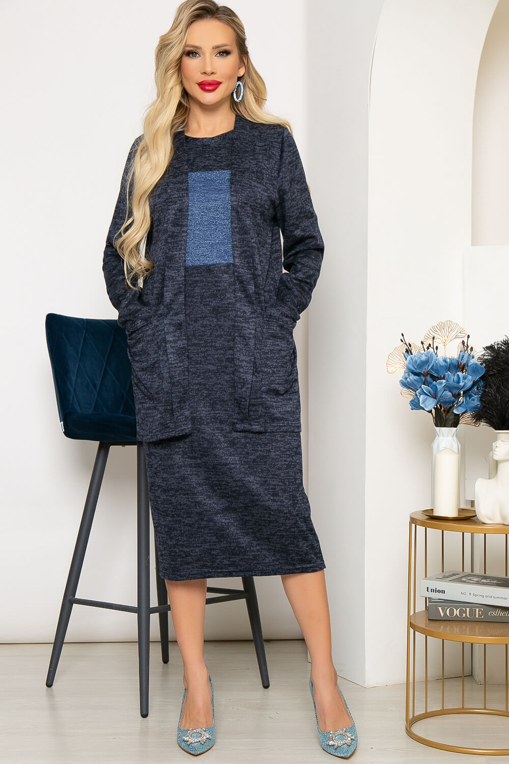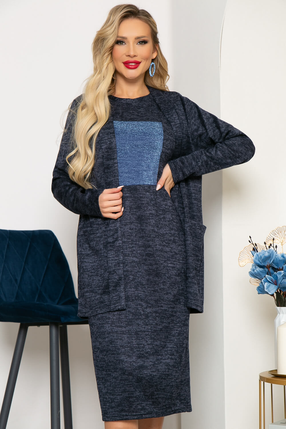 Костюм-двойка из трикотажа, состоящий из платья универсальной длины и кардигана. Такой комплект избавит вас от переживаний на тему: "Что надеть?", ведь это уже готовый монохромный образ. Платье имеет лаконичный фасон, поэтому подойдёт практически для любого случая, а кардиган подарит тепло и комфорт в том случае, если вам станет прохладно. Платье полуприлегающего силуэта, рукав втачной, короткий. Кардиган же оснащен длинным рукавом и имеет свободный крой.