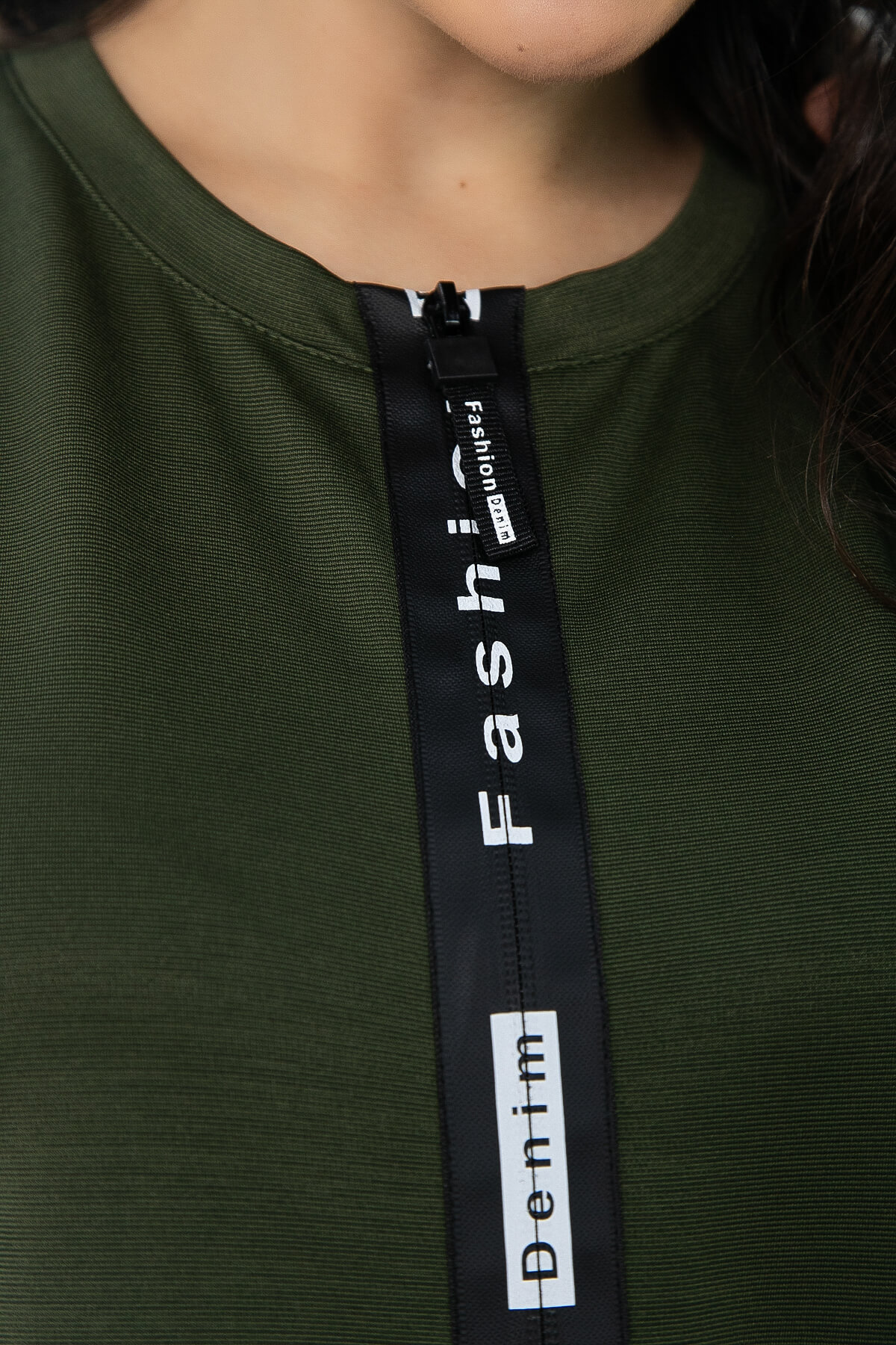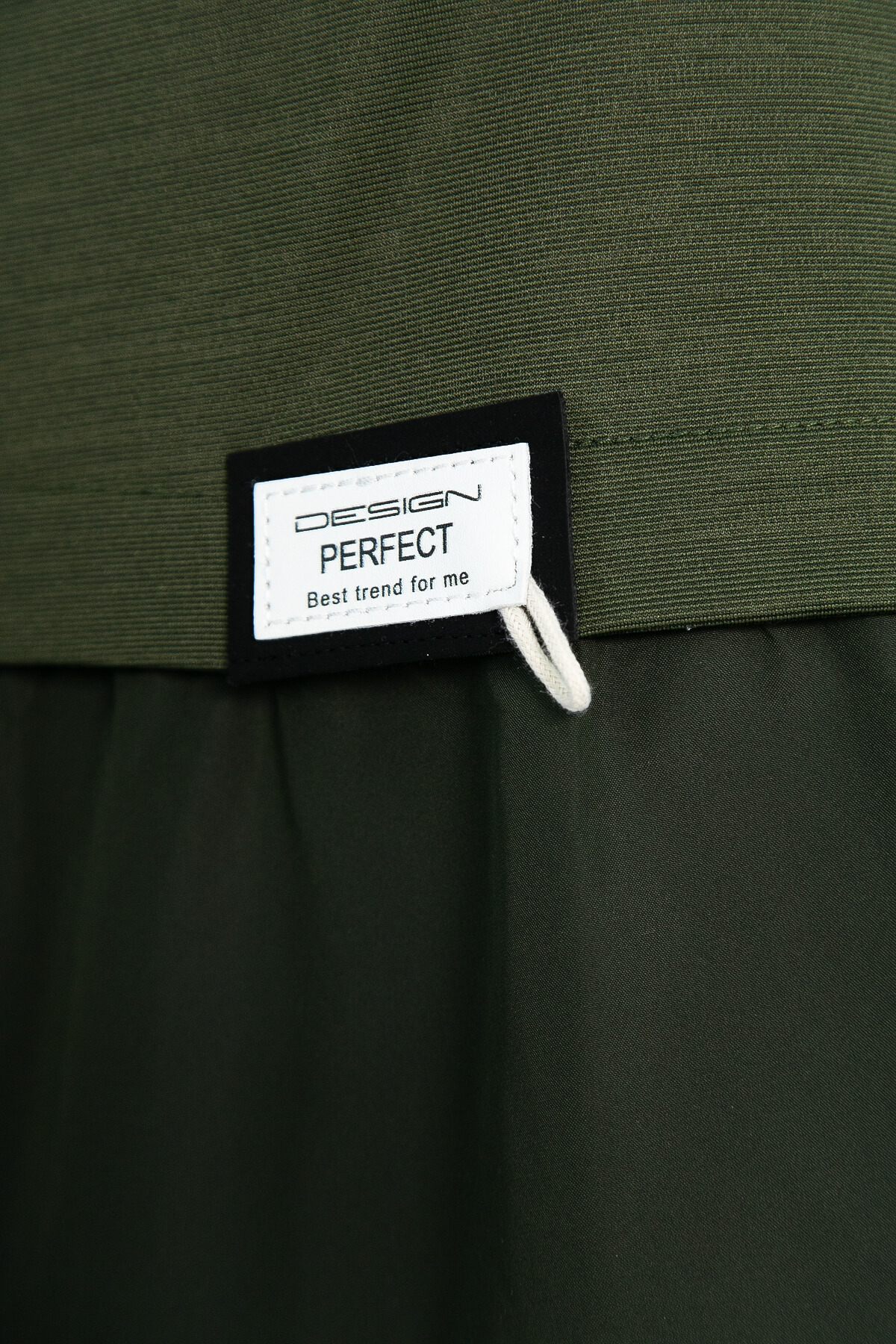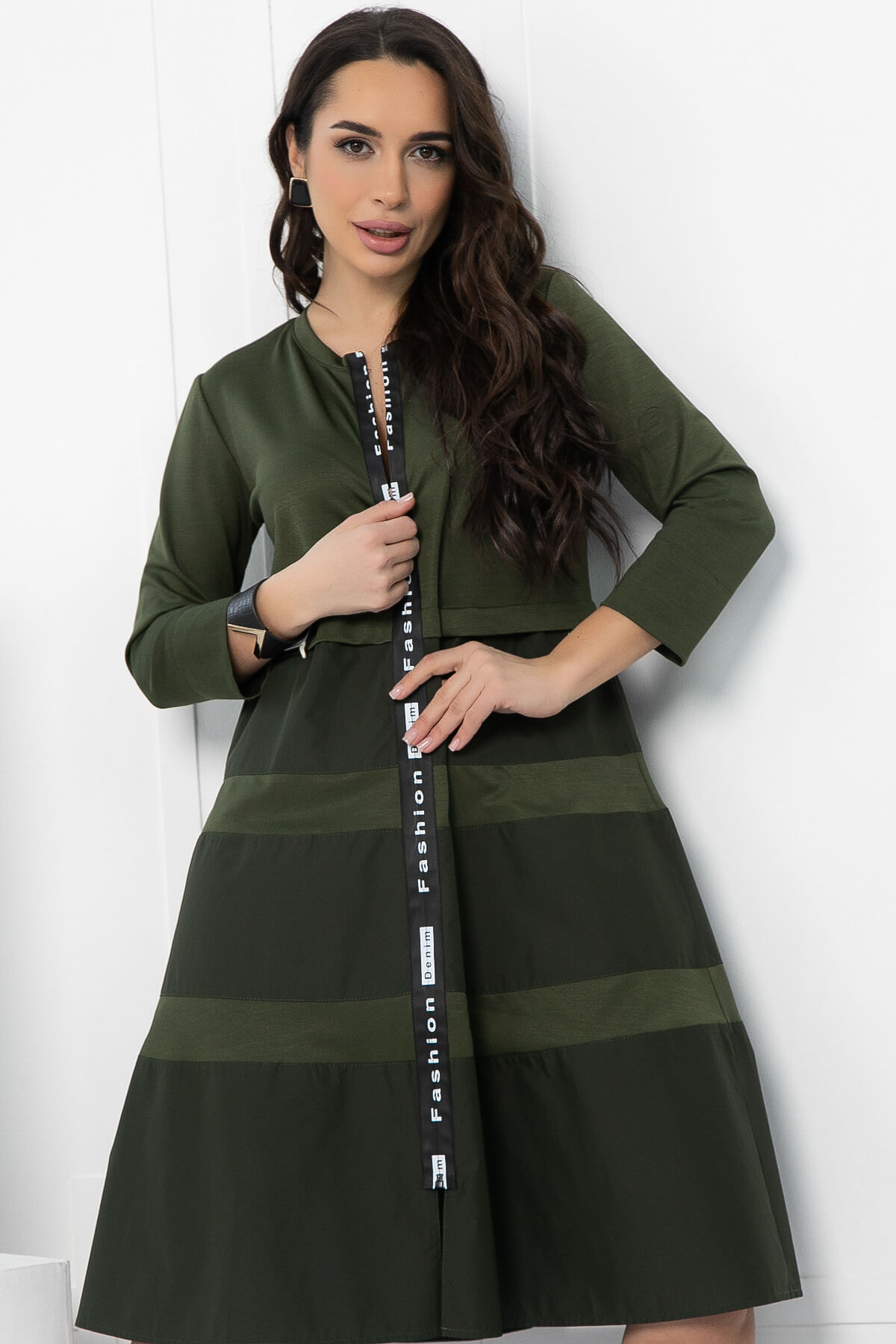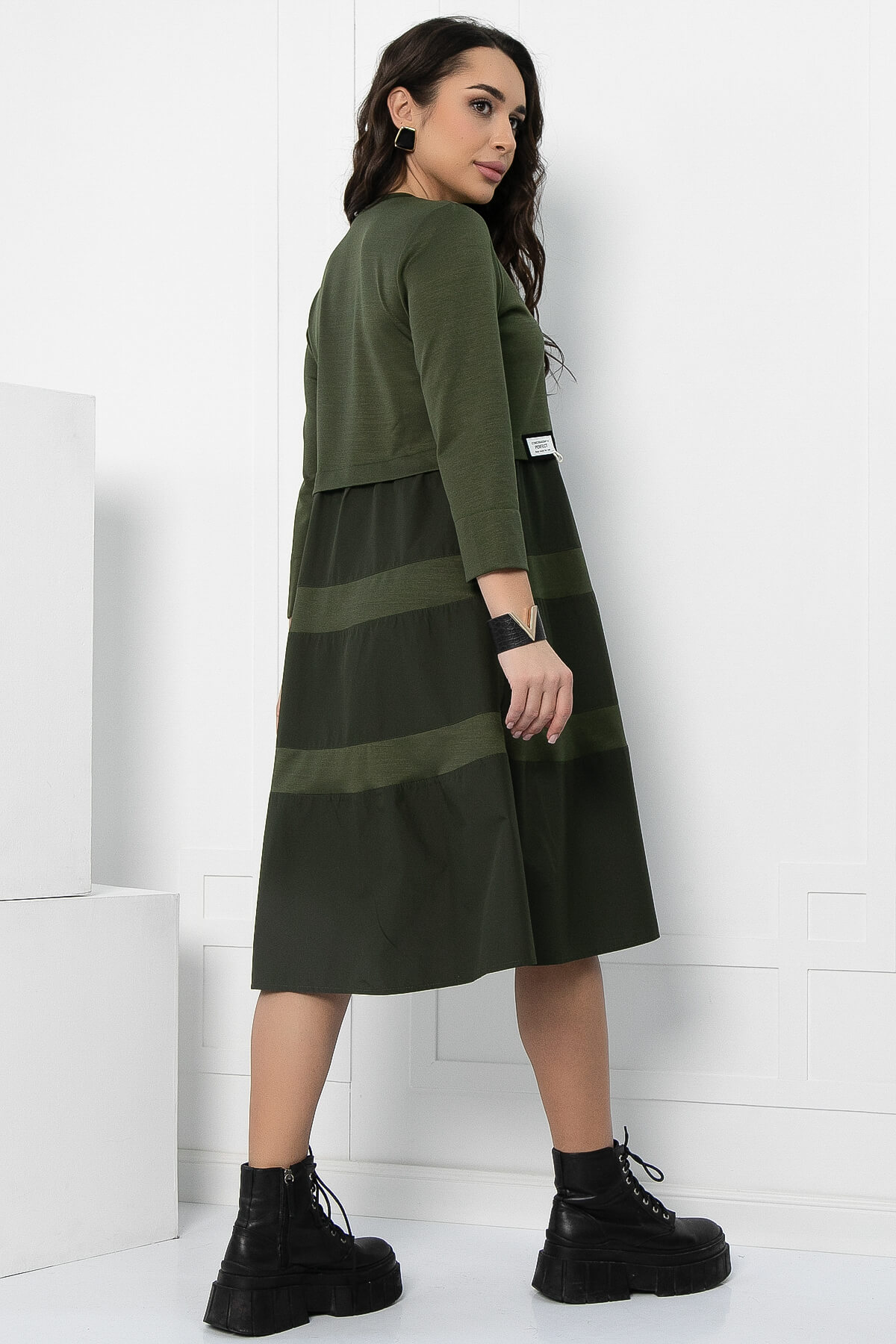 Повседневное платье в стиле спорт-шик из комбинированных материалов: плотного трикотажа и плащевки. Платье отрезное по линии талии, юбка состоит из ярусов. Такой фасон прекрасно подойдёт для повседневных мероприятий, будет хорошо сочетаться, как с обувью на плоской подошве, так и с каблуком. Плащевка неприхотлива в уходе, любые брызги или капли с неё можно удалить обычной влажной салфеткой. Молния по всей длине платья также является декоративным элементом. Платье без подкладки.