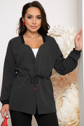 Жакет из костюмной ткани подойдёт как для офисных образов, так и стильно дополнит повседневные. Пояс-кулиска позволяет подчеркнуть линию талии. Рукав и отделка воротника оформлены чёрной мягкой резинкой. Рукав длинный, втачной, линия плеча спущена.