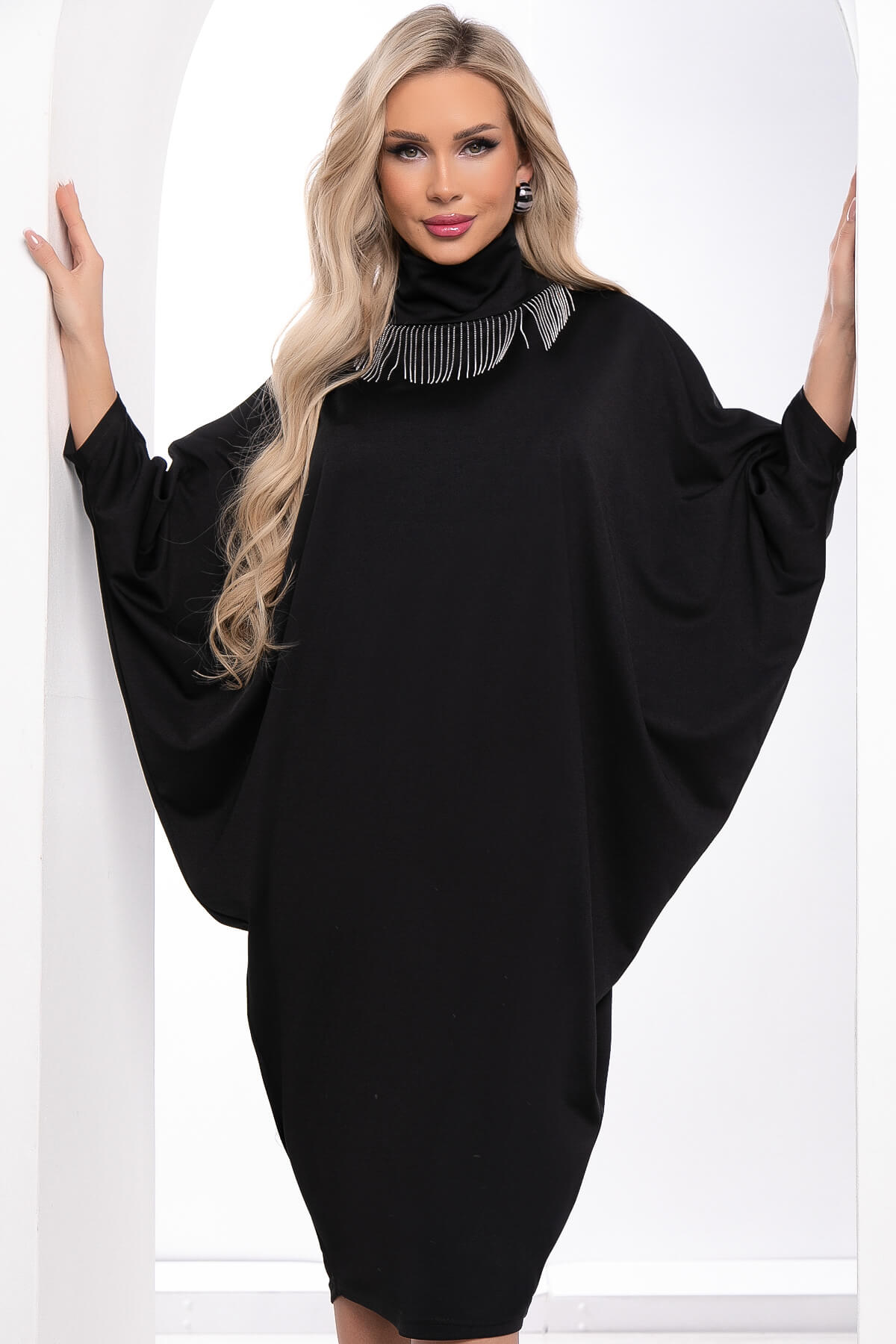 Трикотажное платье свободного кроя . Модель подразумевает свободную посадку. Рукав длинный, скроенный по типу "летучая мышь". Воротник хомут с акцентной деталью.
