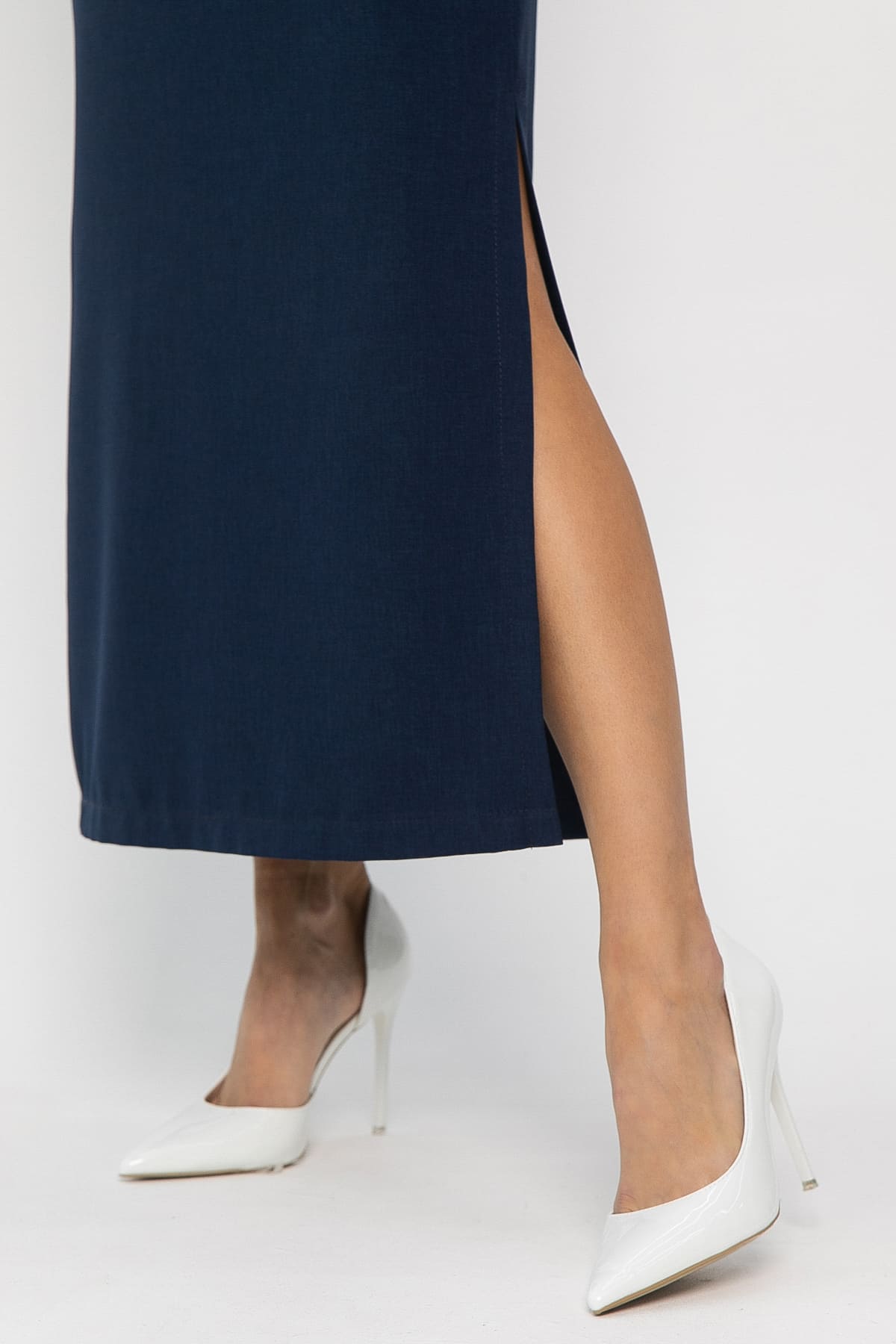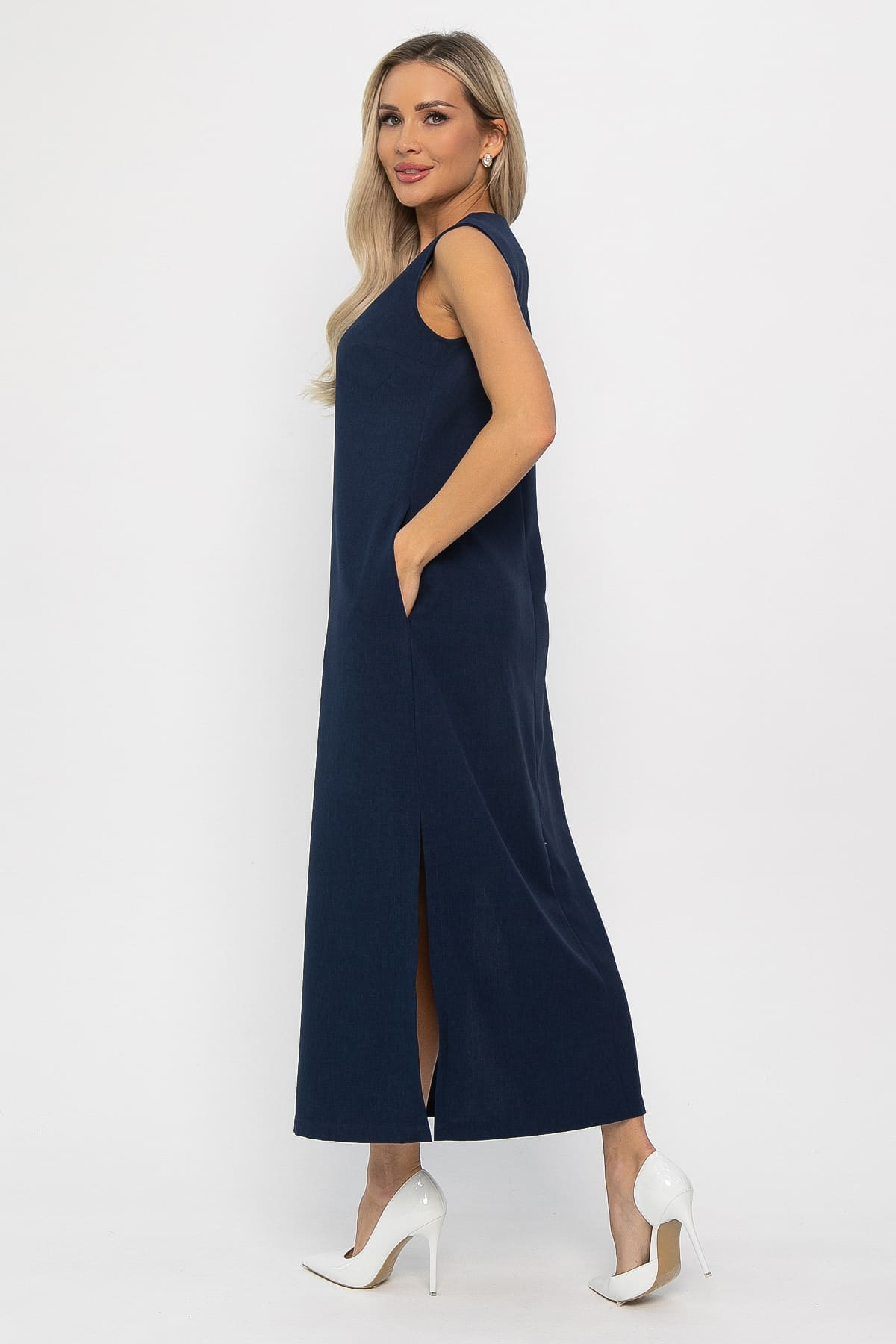 Платье-сарафан в синем цвете — это комфортный элемент гардероба, который станет незаменимым для любой женщины. Безрукавный крой обеспечивает максимальный комфорт и свободу движений, что особенно приятно в теплую погоду. Разрезы по бокам добавляют легкость и делают платье еще более комфортным. Идеально для прогулок по городу или встреч с друзьями, сочетая стиль и практичность.